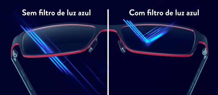 E, para proteger nossos olhos da luz azul-violeta, foi desenvolvida uma lente especial que filtra essa luz azul prejudicial, permitindo apenas a chegada da luz azul-turquesa (natural), melhorando nosso conforto visual. Assim, os óculos com lentes que filtram a luz azul é uma excelente alternativa para quem passa horas em frente ao computador ou celular.
